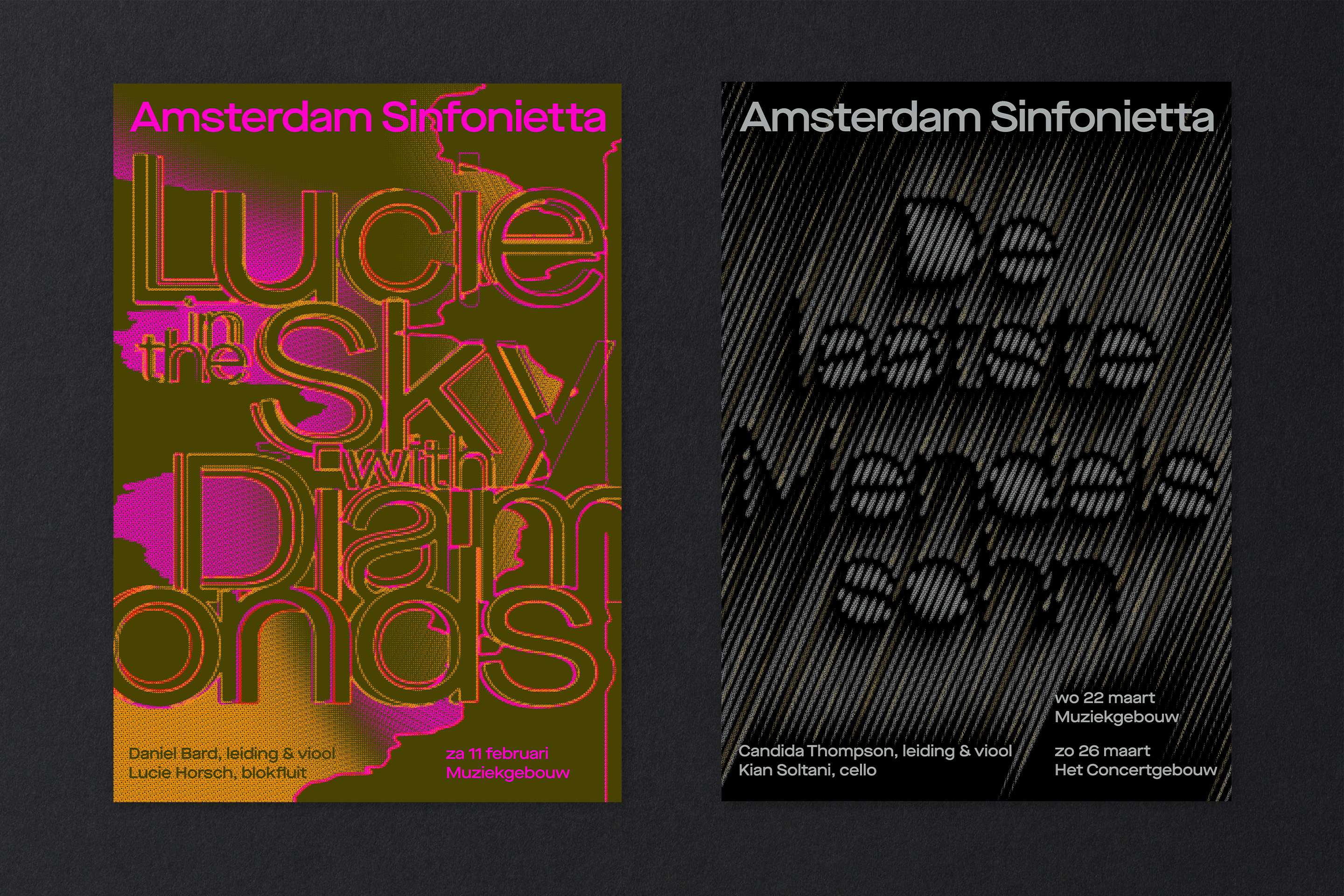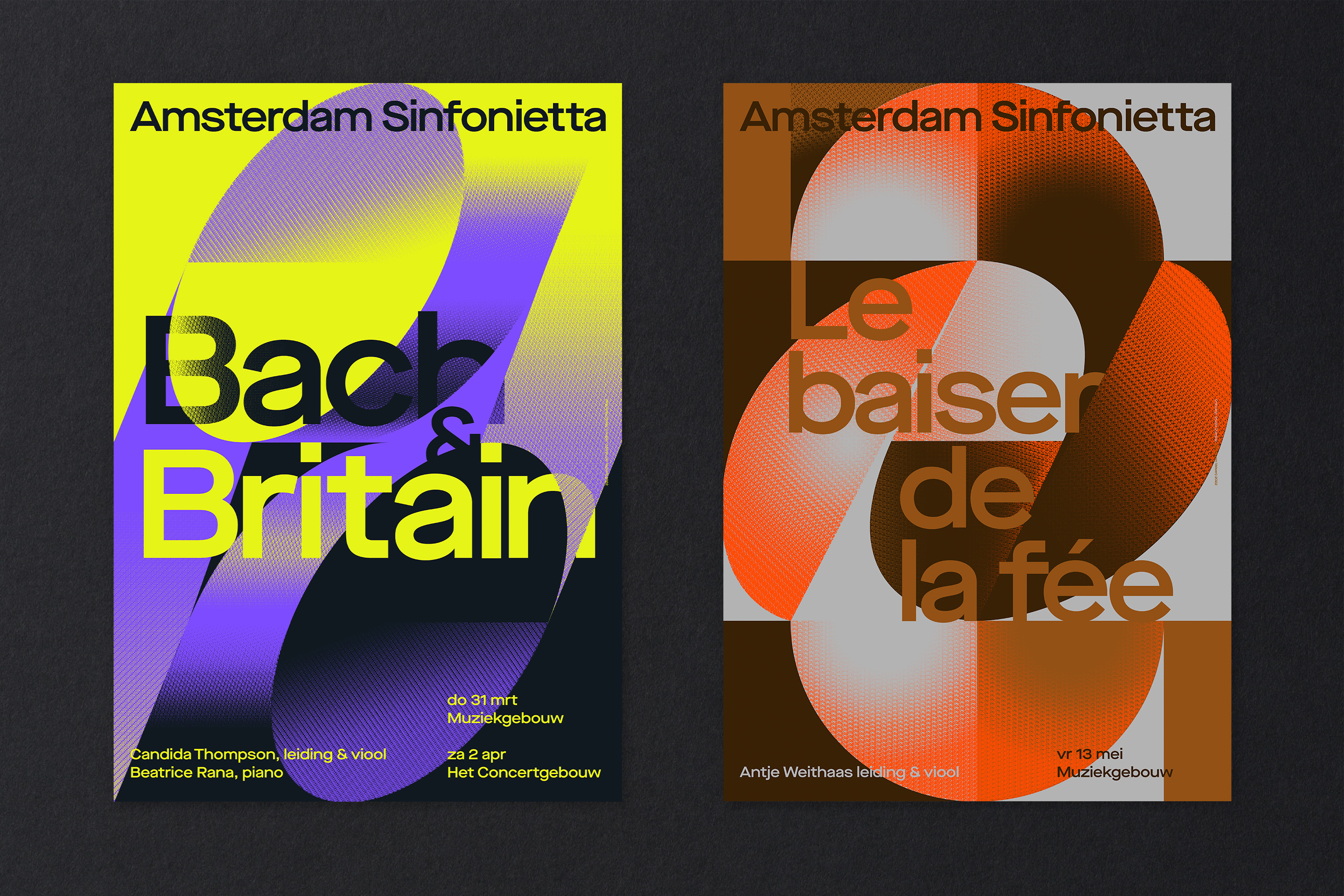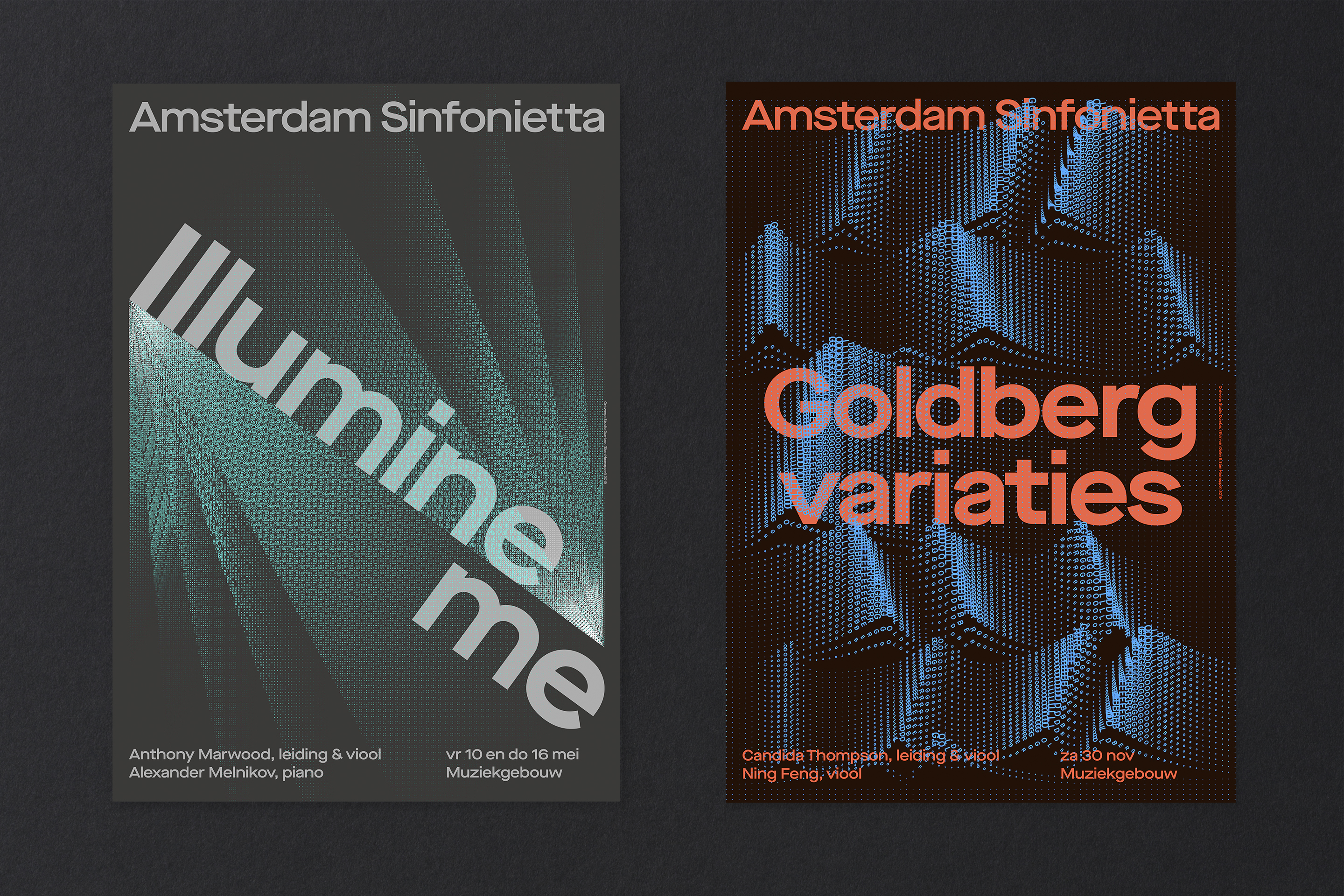 Founded in 1988, Amsterdam Sinfonietta is an independent music ensemble with an international reputation and a rich, varied repertoire. Studio Dumbar/DEPT® has worked with the ensemble for over a decade, designing their new brand identity (which launched in 2018) as well as its predecessor. One of the most notable aspects of the collaboration is the evolving poster series designed to advertise concerts.