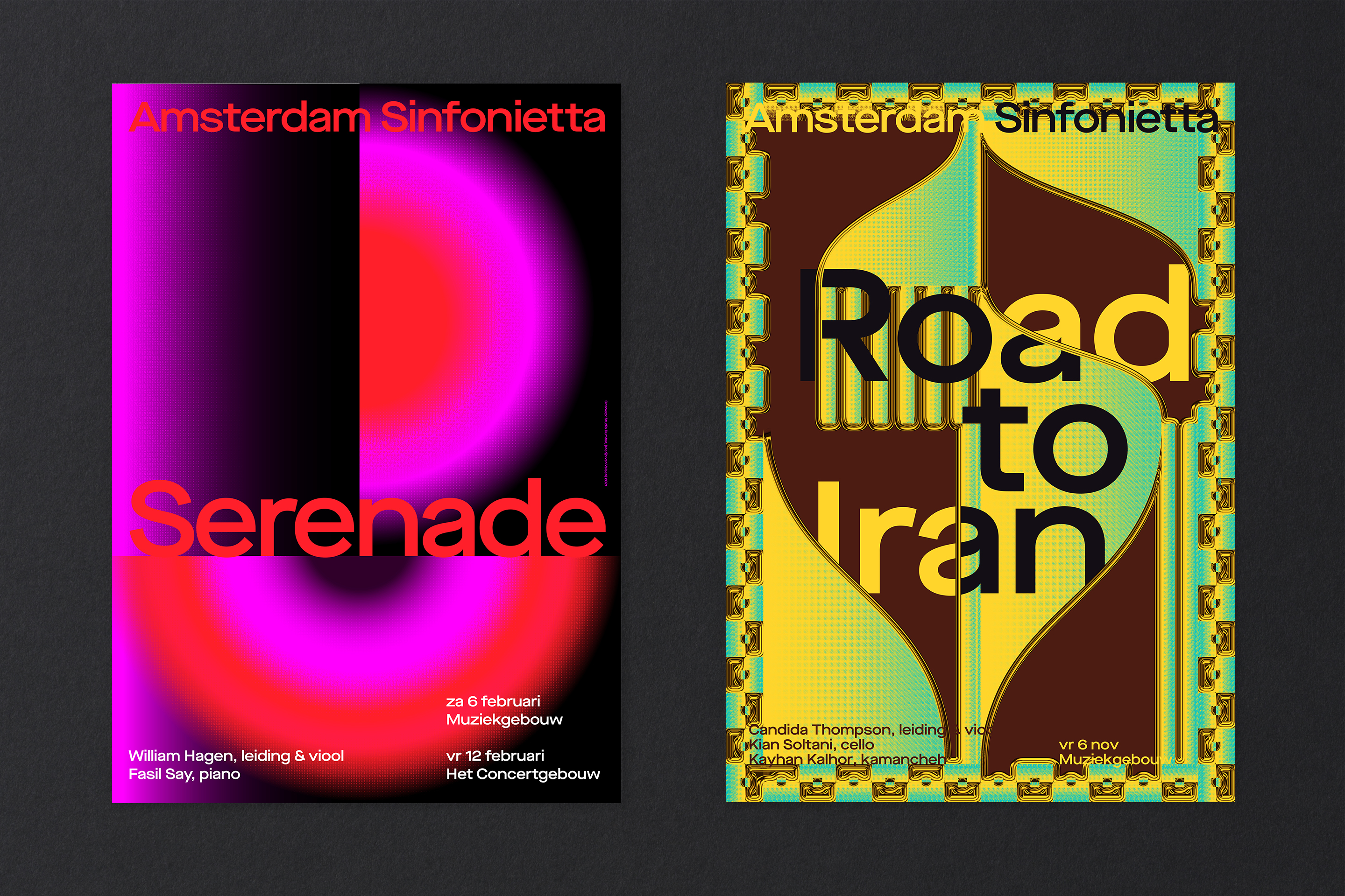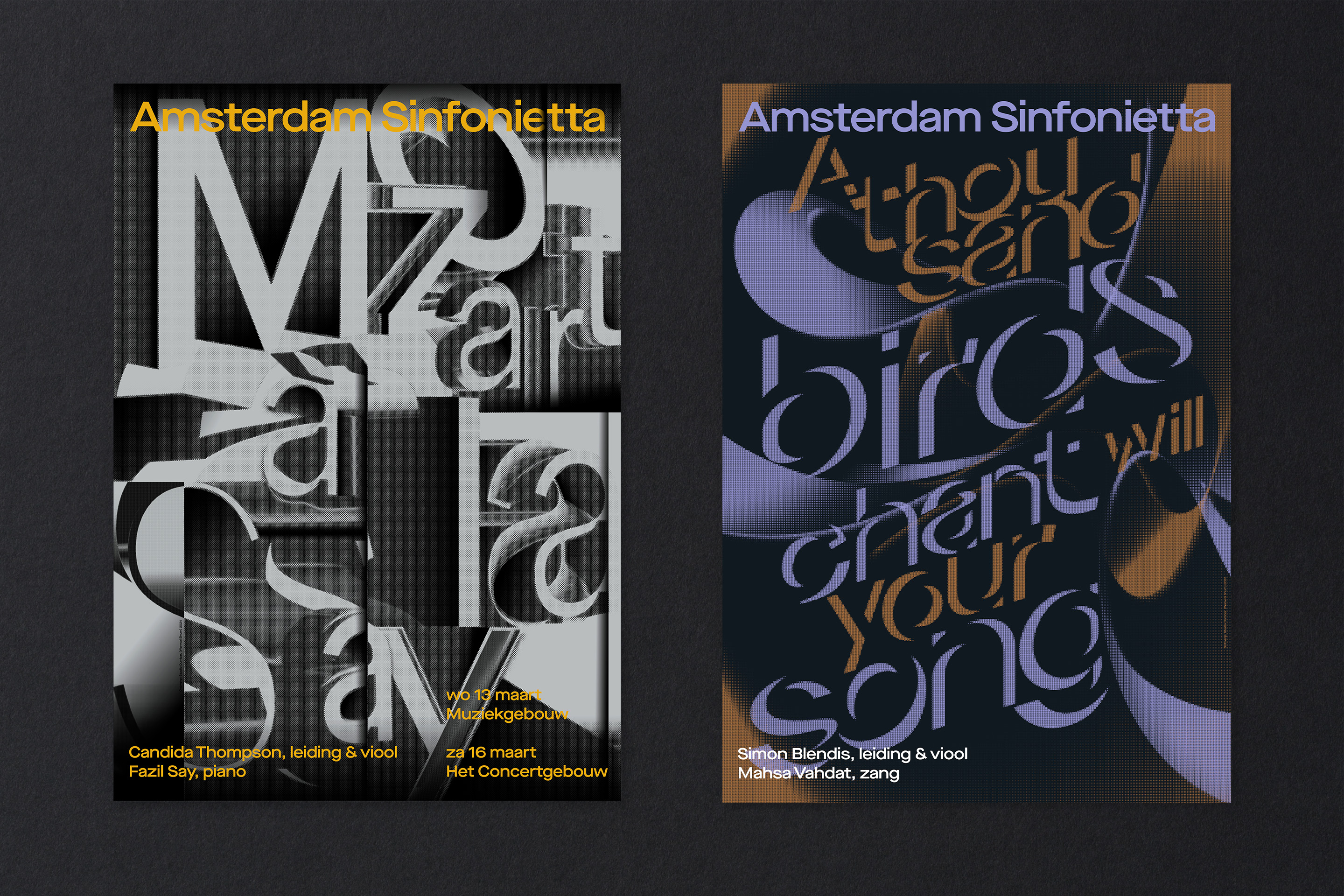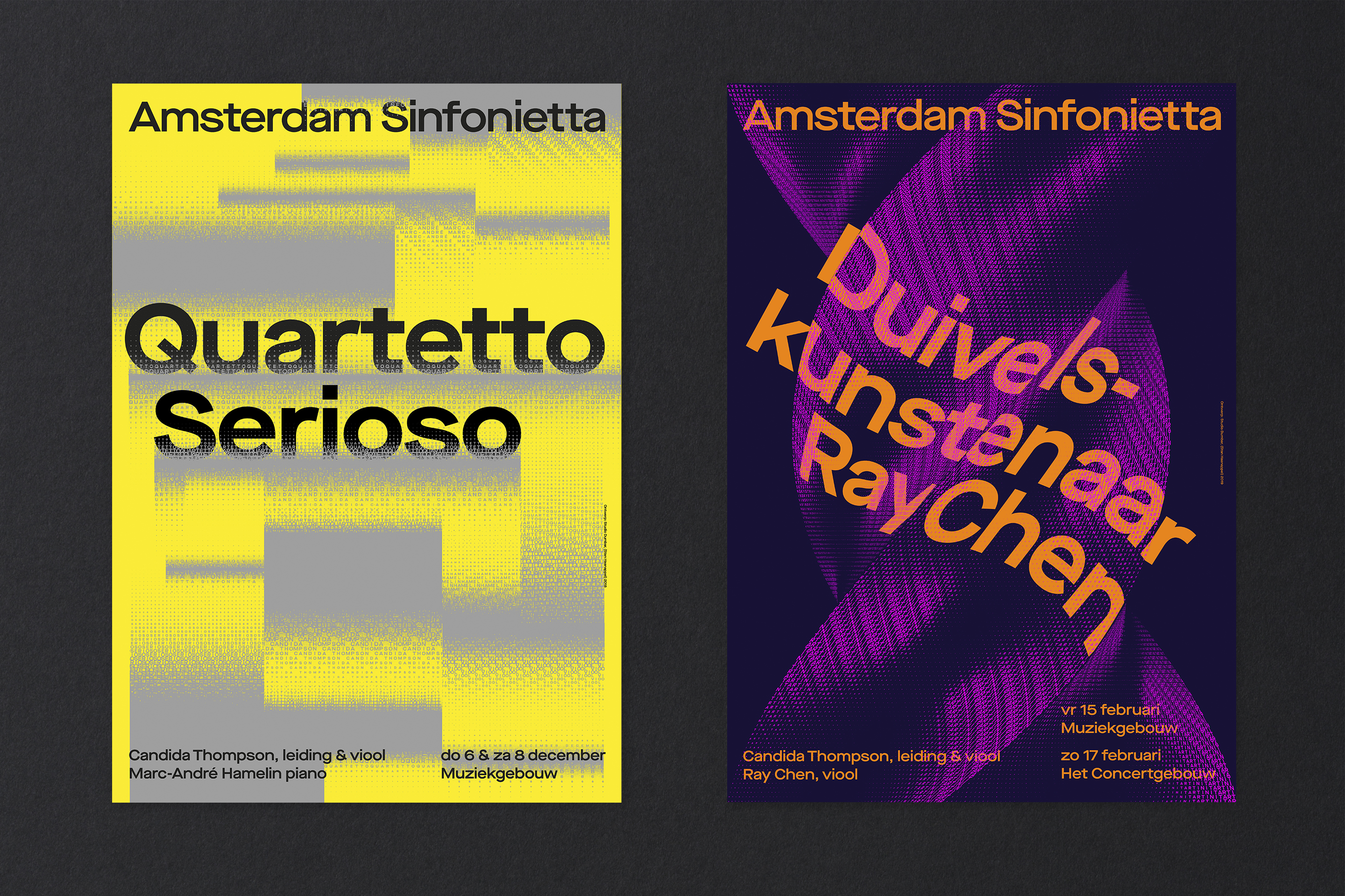Founded in 1988, Amsterdam Sinfonietta is an independent music ensemble with an international reputation and a rich, varied repertoire. Studio Dumbar/DEPT® has worked with the ensemble for over a decade, designing their new brand identity (which launched in 2018) as well as its predecessor. One of the most notable aspects of the collaboration is the evolving poster series designed to advertise concerts.