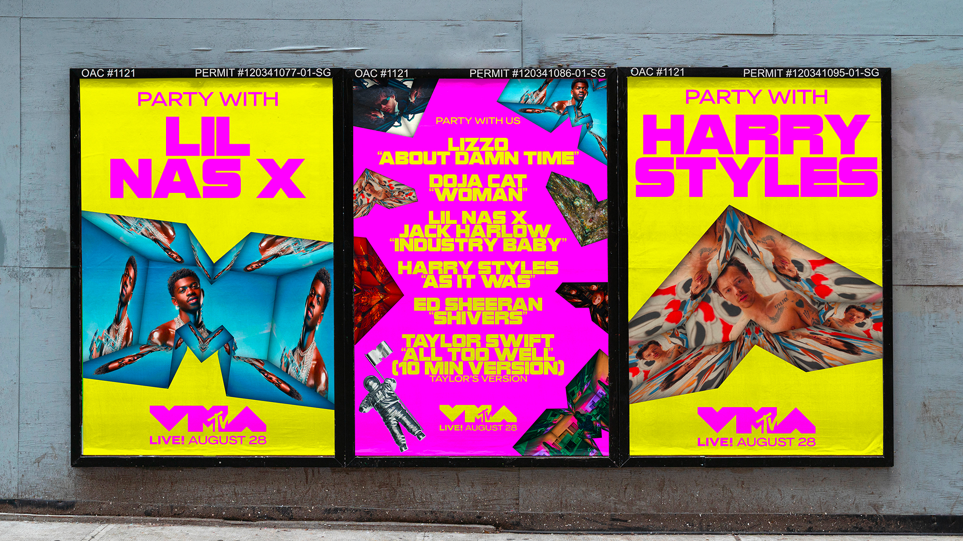 Like all modern broadcasters, MTV communicates with its audience across a myriad of platforms: from TV spots and print ads to digital billboards, social media, online video sites, and more. With numerous channels, artists, categories and awards to promote across so many different platforms, confidence and consistency were key. MTV’s theme for the 2022 VMAs encouraged engagement, inviting fans at home to party with us.