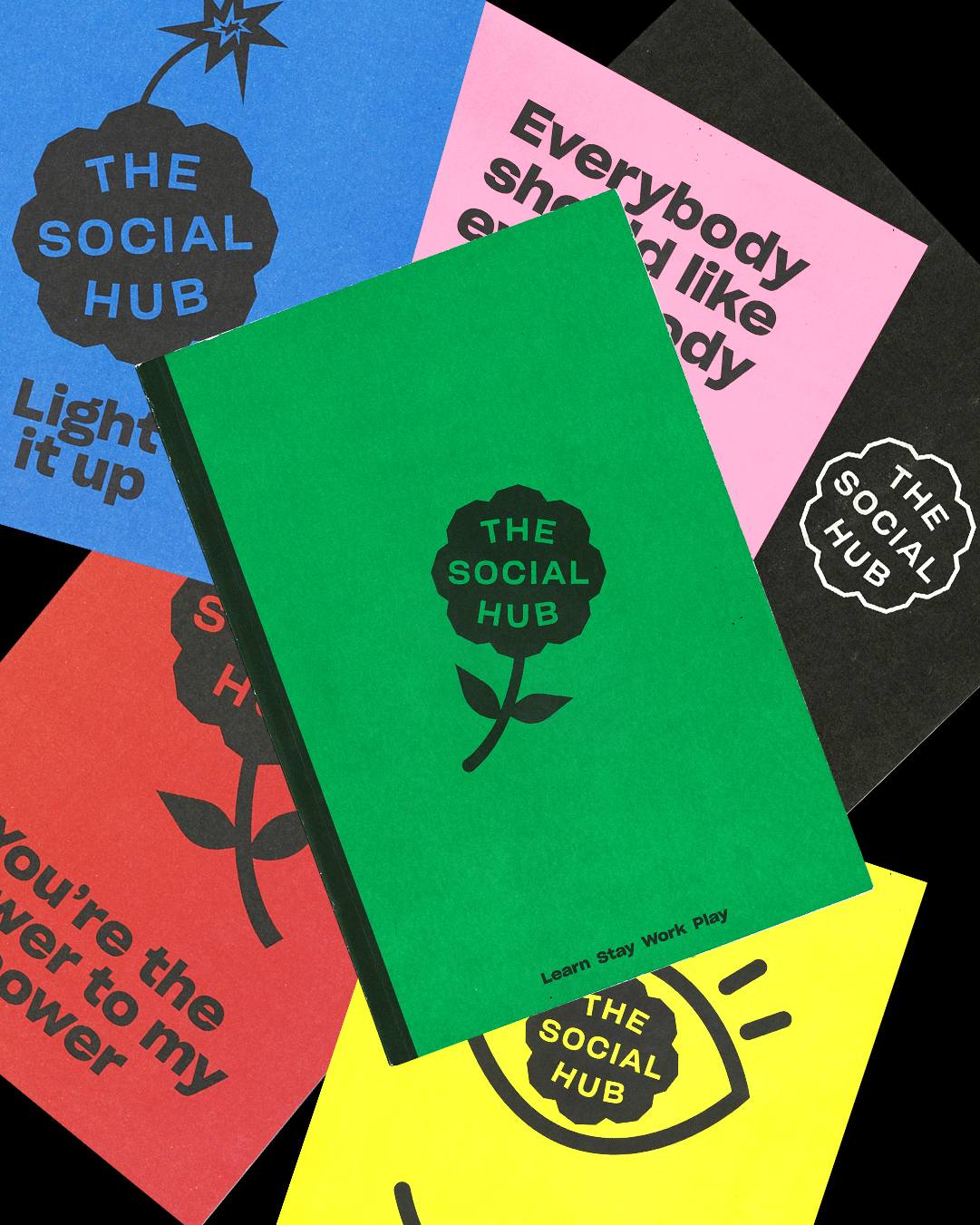 It was important to remain attractive to students, whilst appealing to young, aspirational professionals either based locally, or travelling for business or pleasure. Ideal for application in print, 3D and motion, The Social Hub ‘flower’ is made up of numerous shapes, which come together to form a connected whole. Introducing a warm, versatile character to the brand, the hub symbol is silhouetted (for clarity and impact), and illustrated in playful situations: as a globe; a human eye; a ball in the retro computer game, Pong; an olive in a Martini glass, and so on. Bold, contemporary typography and a bright, primary-led colour palette support this buoyant attitude, further distinguishing The Social Hub from its competitors.