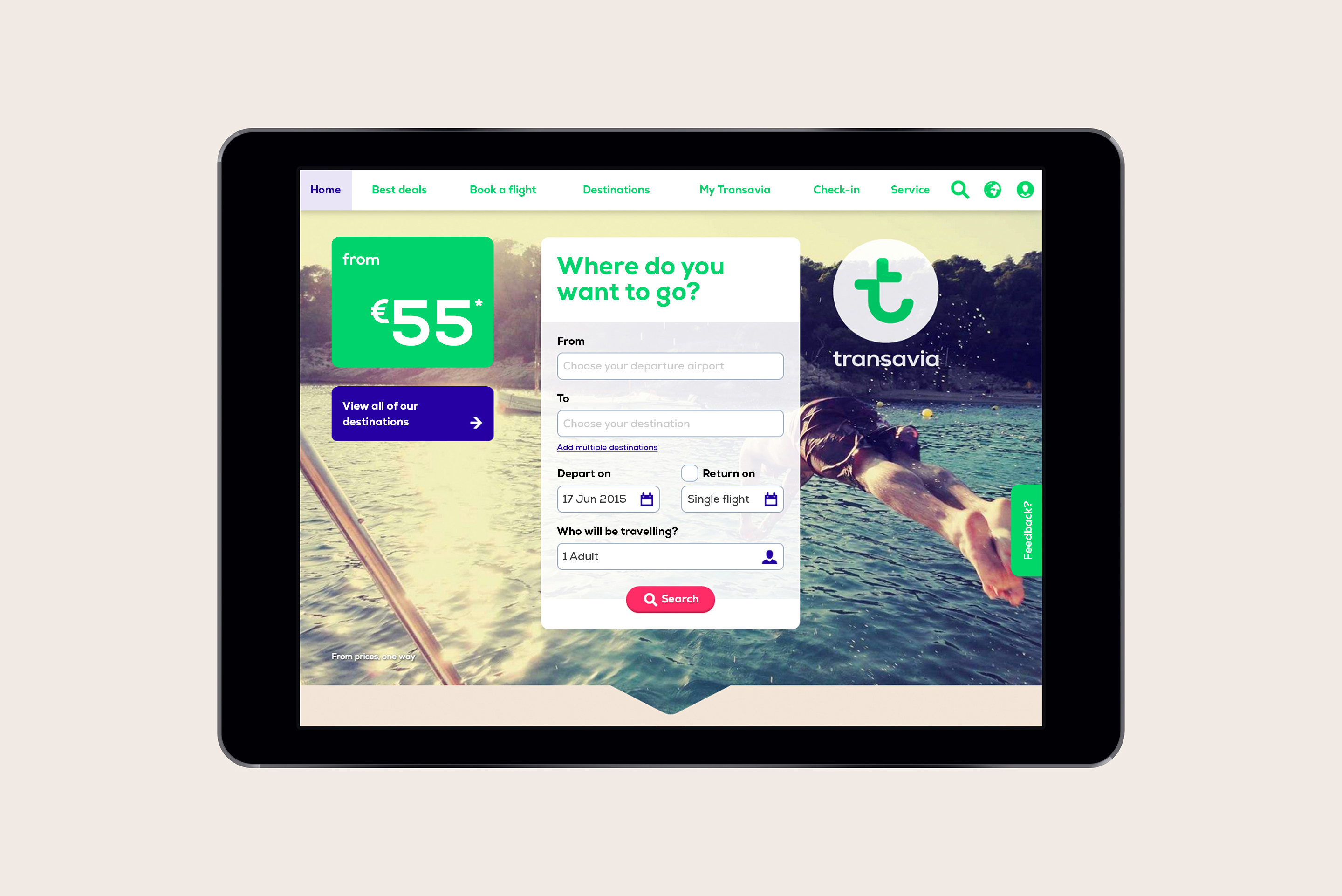 The rebranding of Transavia was prompted by Air France–KLM’s decision to strengthen its position in the low-cost market. The plan: transform Transavia from a charter airline aimed at holidaymakers, to a quality budget airline catering for a wider audience, including business travellers. The re-branding was an integrated process combining company strategy, e-commerce and brand design. With leading digital agency Mirabeau, Transavia began to work on a new e-commerce platform to increase ancillary sales, improve the conversion of flights and reduce operational costs. Having identified the need to redefine Transavia’s positioning and visual identity (in accordance with Mirabeau’s e-commerce strategy and concept) Studio Dumbar was invited to join the team.